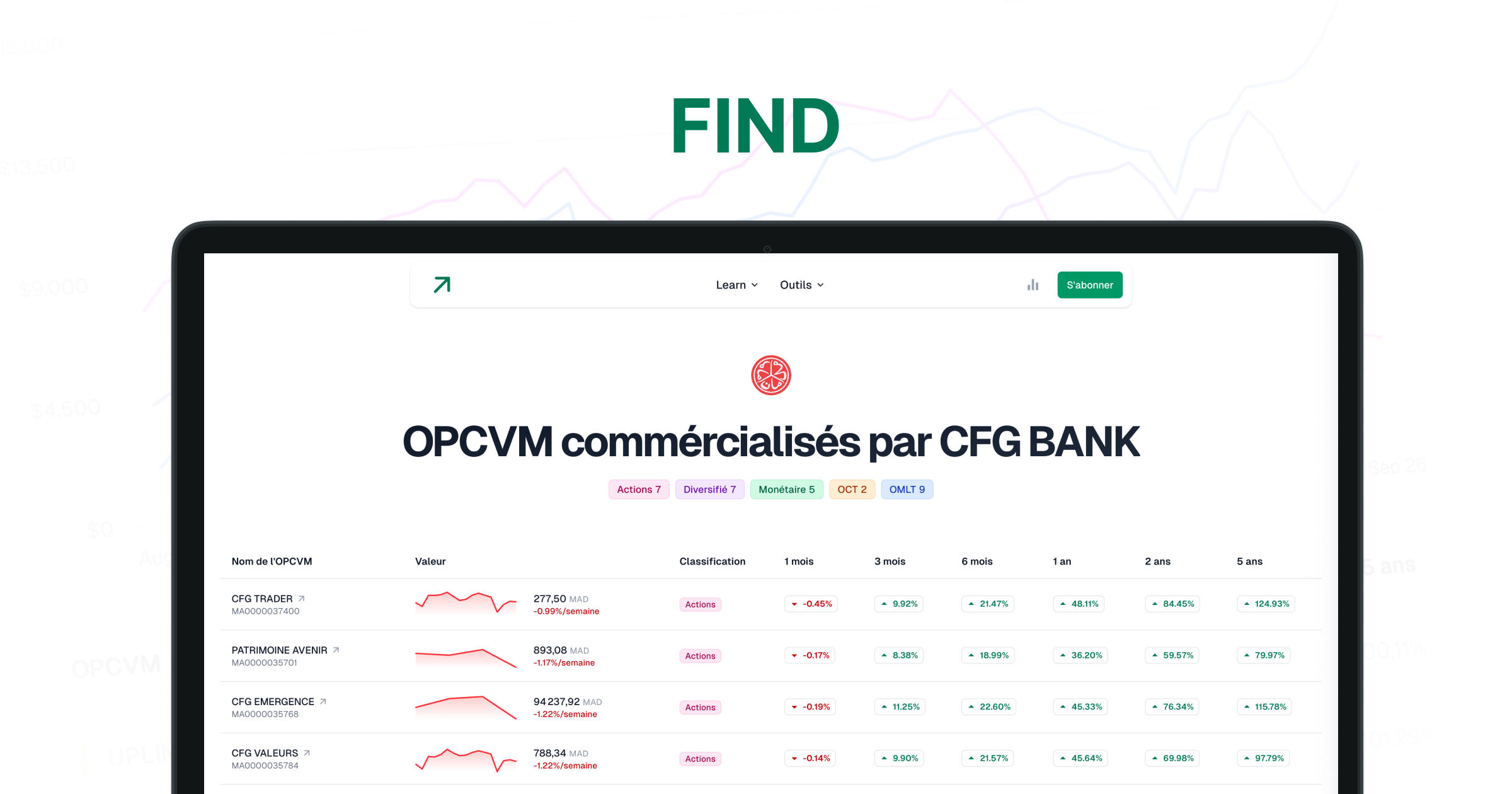 - OPCVM par réseau de distribution: Découvrez les OPCVM proposés par les différents réseaux bancaires, sociétés de gestion et assurances au Maroc. Voici un exemple avec CFG Bank.
