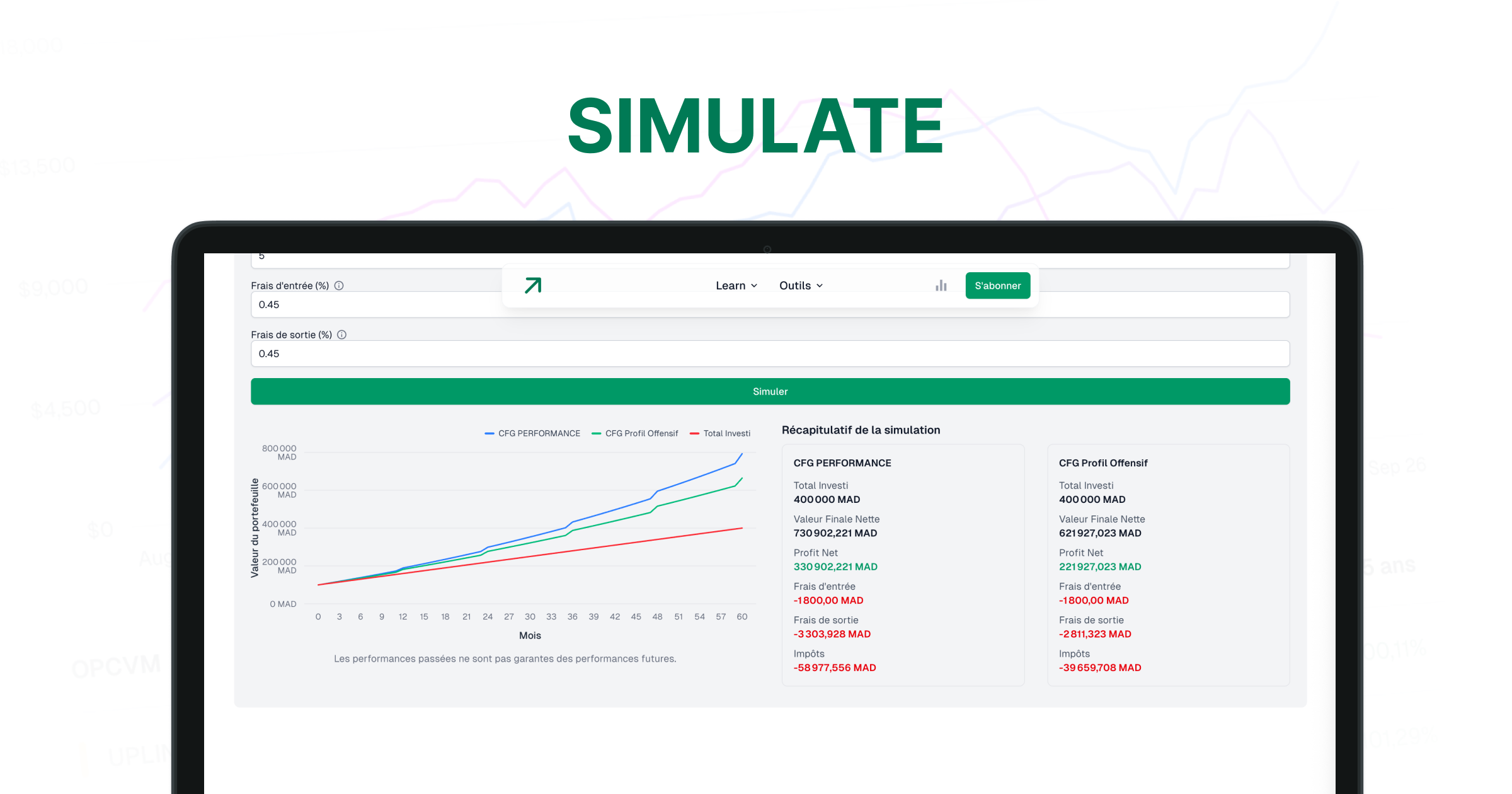- Simulateur d'investissement : Utilisez notre puissant simulateur pour modéliser des scénarios d'investissement potentiels et visualiser la croissance de votre portefeuille au fil du temps.