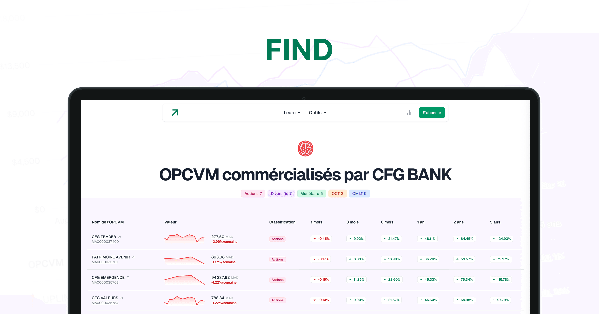 - OPCVM par réseau de distribution: Découvrez les OPCVM proposés par les différents réseaux bancaires, sociétés de gestion et assurances au Maroc. Voici un exemple avec CFG Bank.