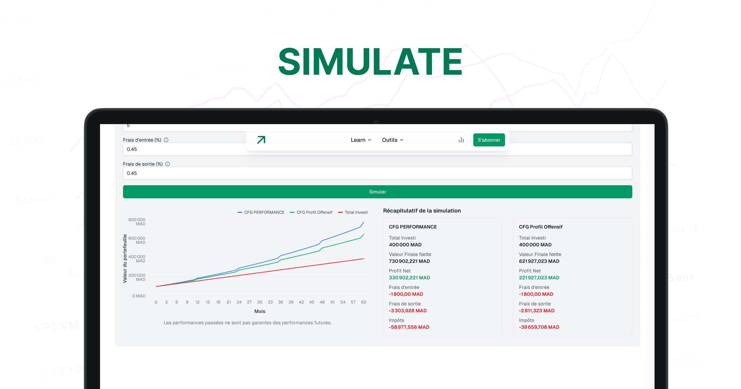 - Simulateur d'investissement : Utilisez notre puissant simulateur pour modéliser des scénarios d'investissement potentiels et visualiser la croissance de votre portefeuille au fil du temps.
